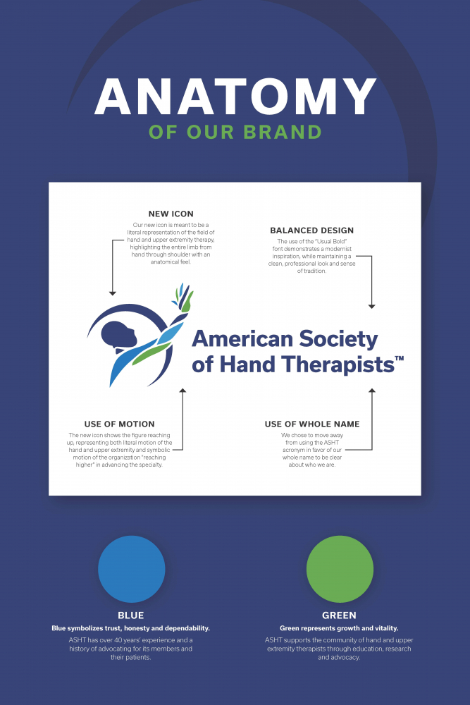 We maintained our name to build on its legacy. However, to be more easily identified, we moved from using the acronym “ASHT” in the logo to the full name, “American Society of Hand Therapists.” We will continue to be known as ASHT in our marketing and other messaging touchpoints, but felt it important to be clearer in the most forward-facing part of the brand, our logo.