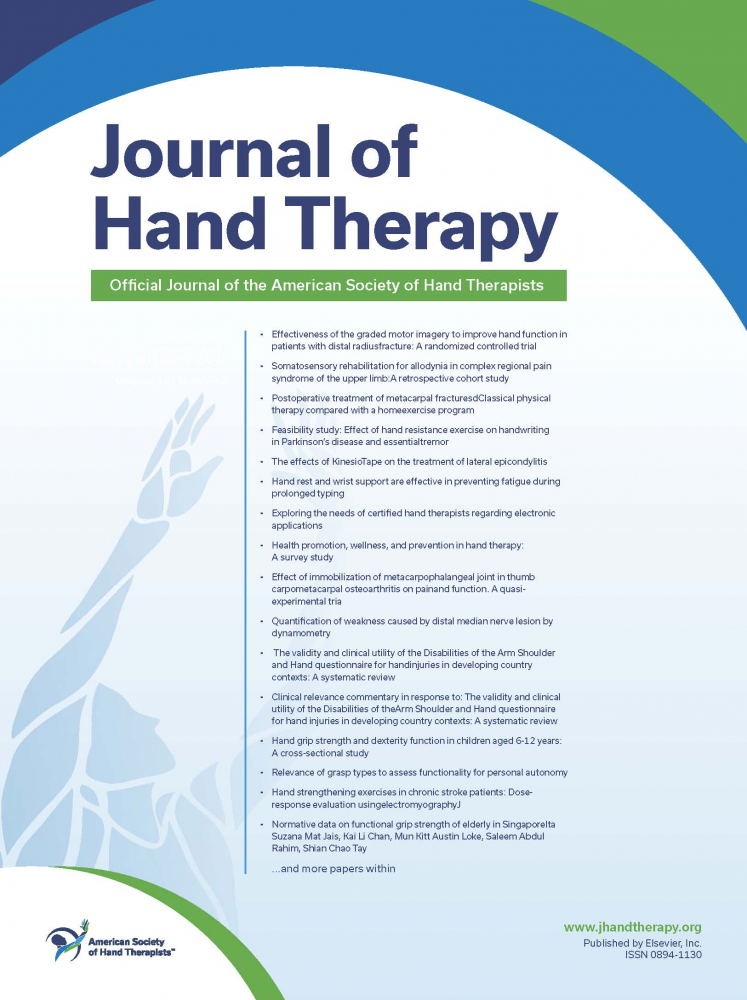 The Journal of Hand Therapy is the official journal of the American Society of Hand Therapists, designed for hand therapists, occupational and physical therapists and other hand specialists involved in the rehabilitation of disabling hand and upper extremity problems. The Journal functions as a source of education and information by publishing scientific and clinical articles. Regular features include original reports, clinical reviews, case studies, editorials and book reviews.